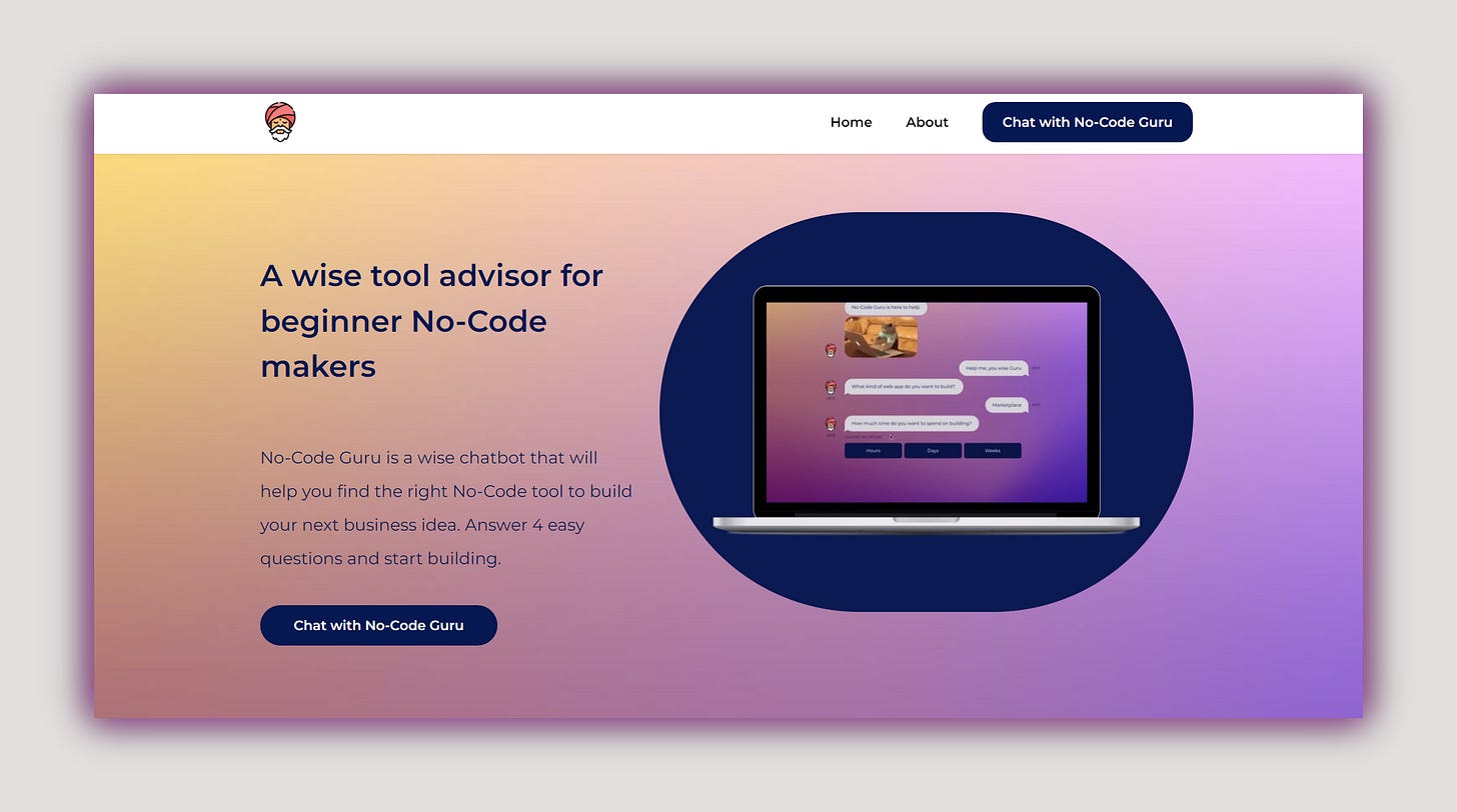 No-Code Guru is a chatbot 💬 that helps builders find the right No-Code tool to build their next business idea. A builder just needs to answer 4 easy questions and start building. Recently, it got acquired by MicroAcquire.